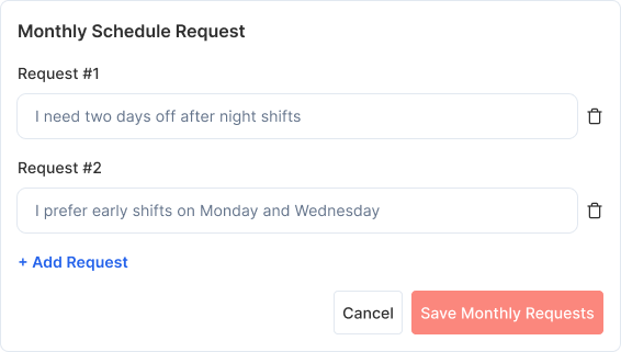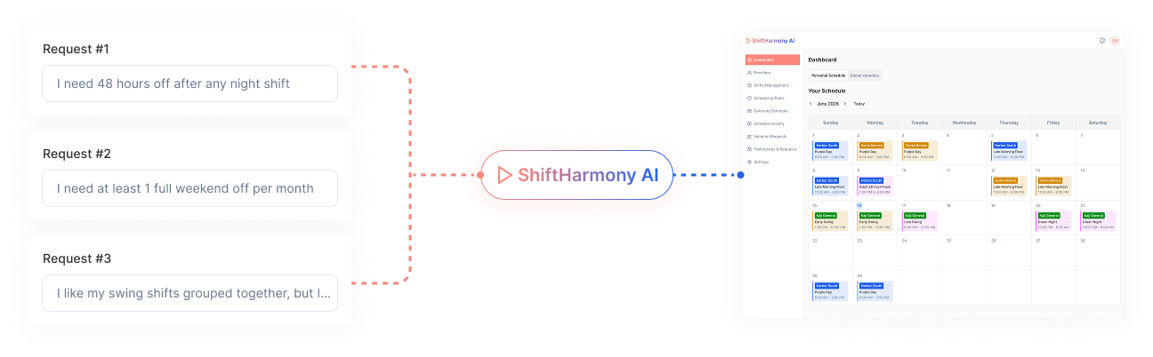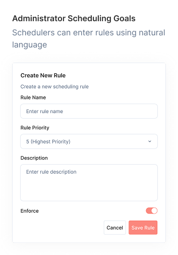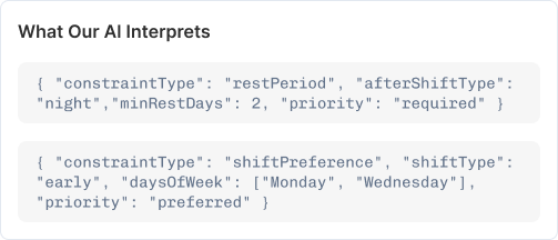 Staff simply type their scheduling needs in simple language. Our AI understands and converts them into scheduling rules automatically.
